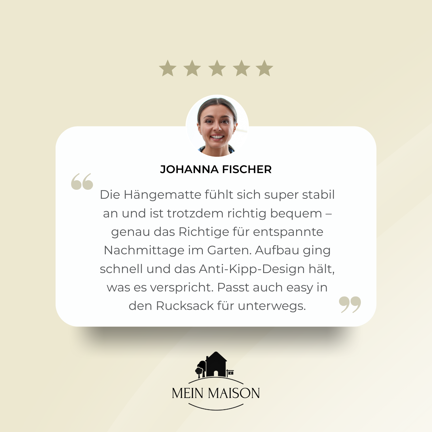 Die RelaxoLounge Hängematte aus strapazierfähigem Canvas vereint Komfort, Stabilität und ein durchdachtes Design für entspannte Momente – ob im Garten, auf dem Balkon oder beim Camping. Genieße den Sommer stilvoll und bequem mit dieser zuverlässigen Outdoor-Hängematte.